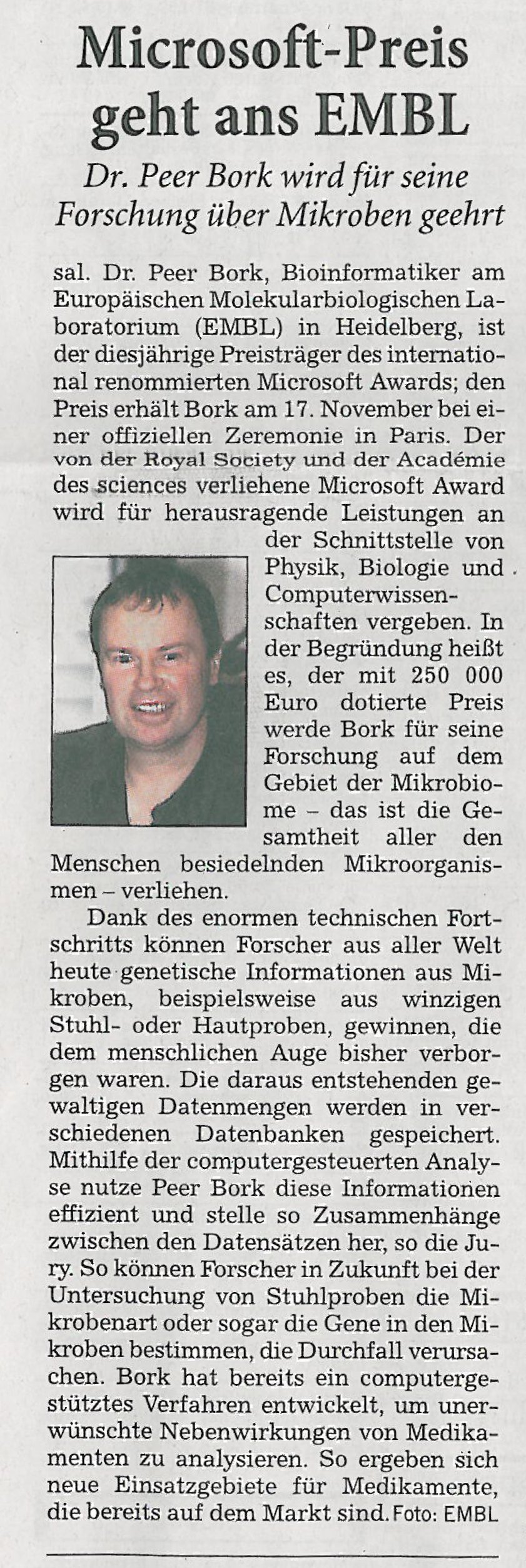 Peer Bork is the 4th in the list of THOMSON SCIENTIFIC's “hottest” researchers of 2004-2005 (Science Watch: Philadelphia, PA USA-London UK - 2006 Feb 27)
